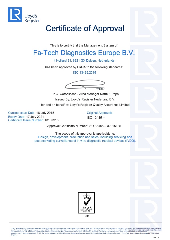 Qualità: Fa-Tech Diagnostics è completamente certificata ISO 13485 - 2016 IVDD. Guardiamo il nostro programma di qualità come un processo continuo. Con questa filosofia possiamo garantire agli utenti finali, e quindi ai pazienti, il miglior prodotto disponibile. Vi preghiamo di contattarci per tutte le vostre richieste su documenti normativi.